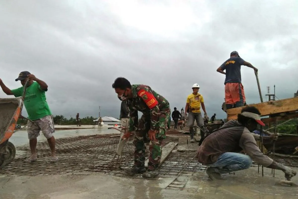Timika (ANTARA) - Prajurit TNI Babinsa 1710-02/Timika, Serda Rusdin Wali membantu masyarakat dalam pembangunan Masjid Al Araf, di Kampung Mawokau Jaya, Distrik Wania, Kabupaten Mimika, Senin.