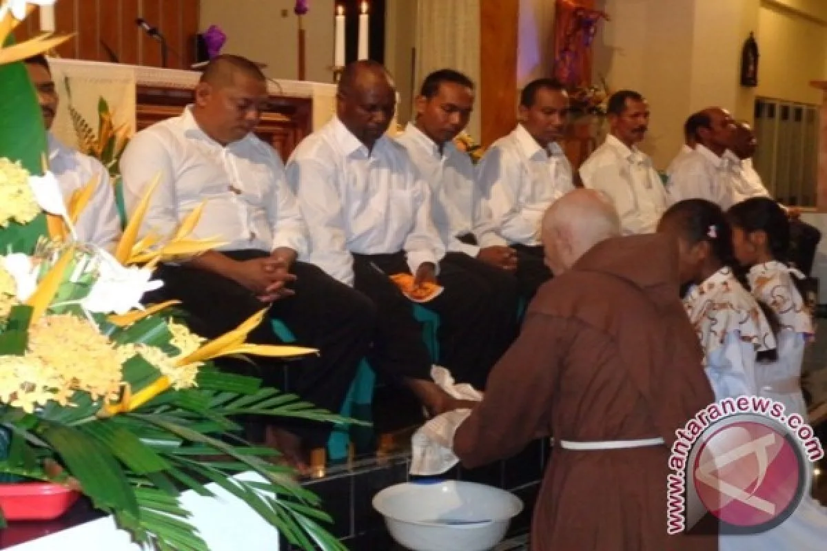 Pastor Bert Hogendoorn OFM yang memimpin perayaan misa Kamis Putih menggelar ritual pembasuhan kaki 12 tokoh umat sebagai peringatan Yesus membasuh kaki 12 orang muridnya.