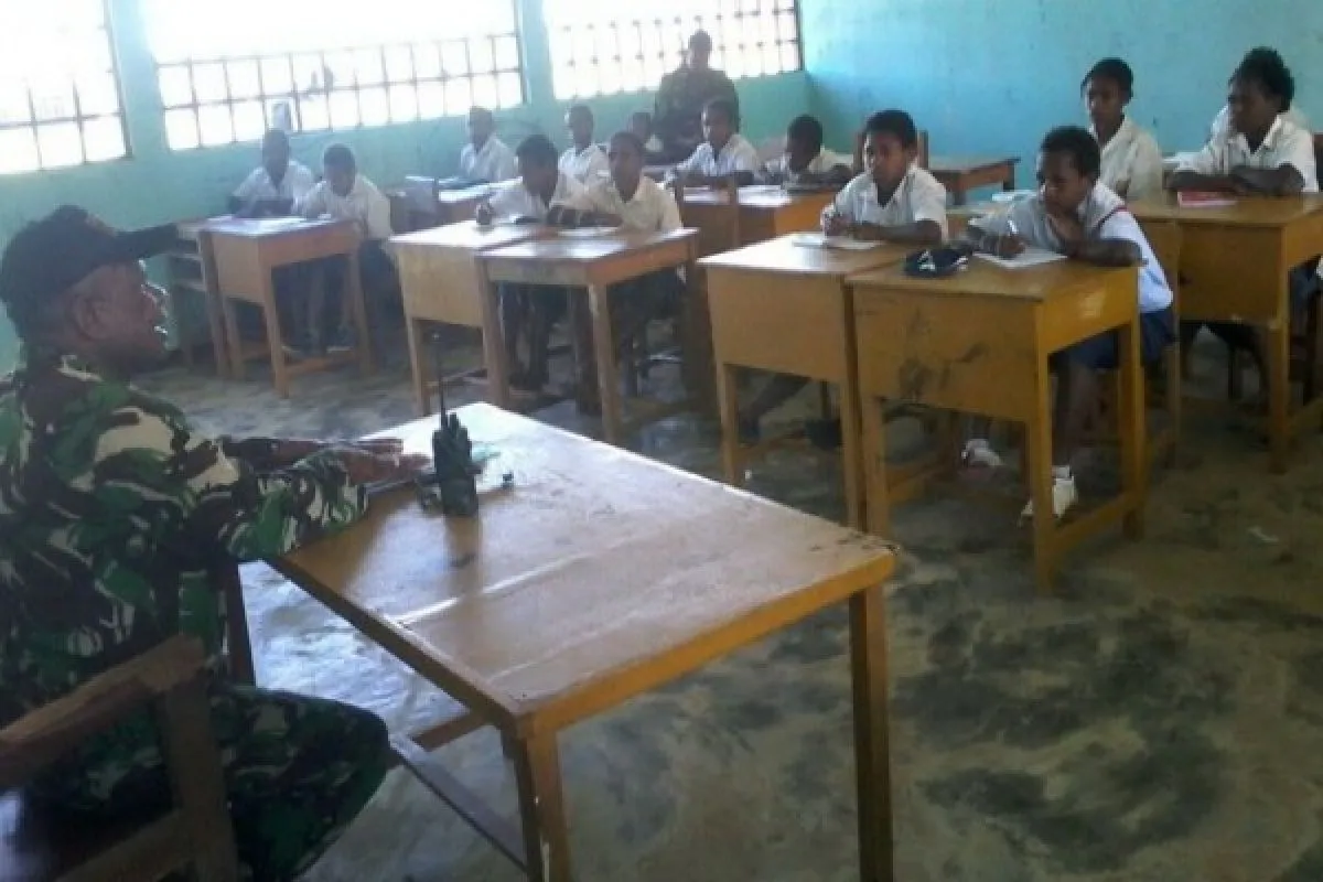 Jayapura (Antara Papua) - Babinsa Koramil 1702-08 Kurulu, Kodim 1702/Jayawijaya (JWJ) Serda Sugeng dan Serda Deky Prasetyo, membantu mengajar di SMPN 4 Kurulu, Kabupaten Jayawijaya, Provinsi Papau, pada Rabu.