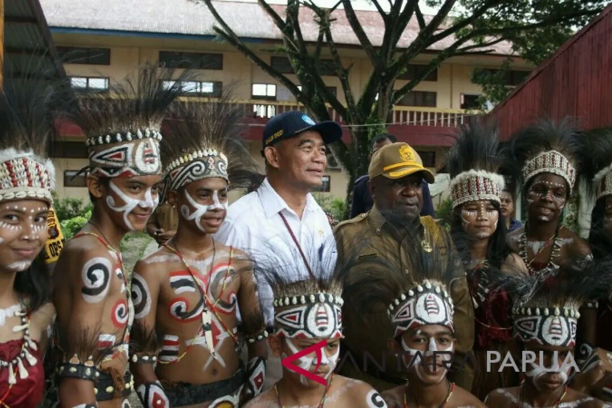 Mendikbud Muhadjir Effendy yang didampingi Sekda Kabupaten Mimika Ausilius You, berfoto bersama para siswa SMP St. Bernardus Timika, saat memantau pelaksanaan UN SMP, Senin (23/4). (Foto: Antaranews Papua/Jeremias Rahadat)
