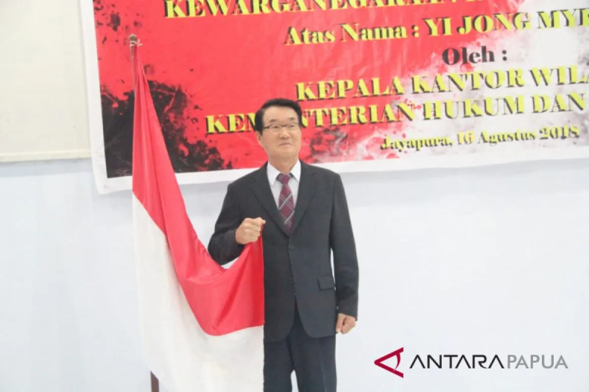 Jayapura (Antaranews Papua) - Yi Jong Myeong resmi beralih kewarganegaraan dari Korea Selatan menjadi Warga Negara Indonesia (WNI), setelah diambil sumpah oleh Kepala Kantor Wilayah (Kakanwil) Kementerian Hukum dan HAM (Kemkumham) Provinsi Papua Iwan Santoso, di Jayapura, Kamis.