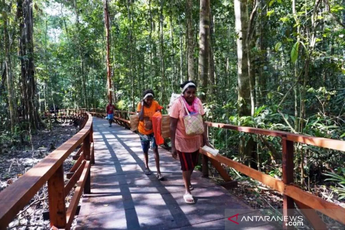 Dua perempuan berjalan di jembatan sepanjang 3.250 meter di kawasan Hutan Klaso menuju Kampung Klagufuk Malaumkarta, Kabupaten Sorong, Papua Barat, Selasa (16/3/2021). Generasi Pemuda Malaumkarta (GPM) melakukan sejumlah pemetaan potensi pariwisata dengan membuka wisata pengamatan burung (birdwatching) dan satwa endemik Papua lainnya di tengah hutan Klaso Malaumkarta. ANTARA FOTO Papua/Olha Mulalinda/aww.