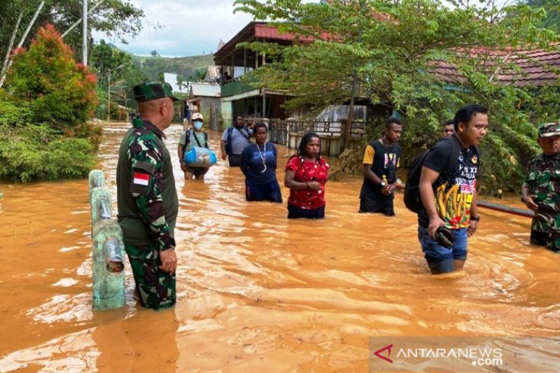 Prajurit Kodim 1701/Jayapura sedang memandu dan mengevakuasi warga di perumahan Organda Padang Bulan Distrik Heram yang rumahnya masih tergenang banjir sekitar satu meter pada Sabtu (8/1/2022). ANTARA Papua/HO-Pendam XVII/Cenderawasih
