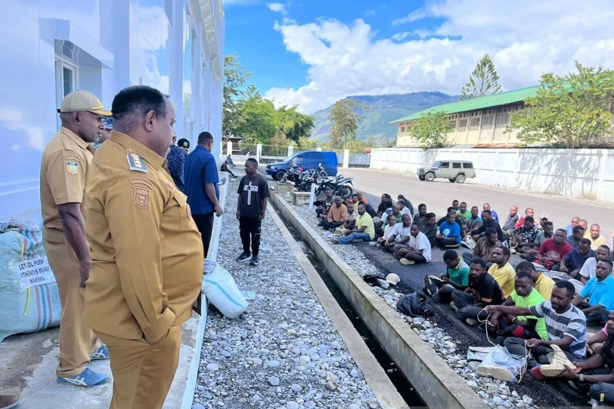Bupati Jayawijaya Atenius Murib menyaksikan pembagian baju pelatihan kepada 100 calon Polisi Baliem yang berlangsung di Kantor Bupati Jayawijaya.