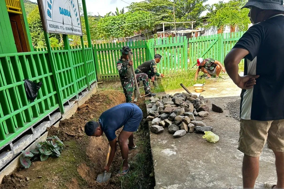 Prajurit TNI Satgas Yonif 511/DY Pos Dabra, Kabupaten Mamberamo Raya, Papua secara bersama-sama membuat drainase di halaman Masjid Al Hafidzi.