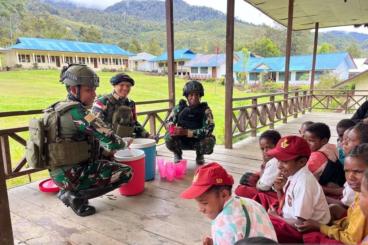 Wamena (ANTARA) - Satuan Tugas (Satgas) Pengamanan Perbatasan (Pamtas) Yonif 511/DY membagikan bubur kacang hijau kepada siswa Sekolah Dasar (SD) Inpres Malagai di Kampung Numbukawi, Distrik Malagai, Kabupaten Lanny Jaya, Papua Pegunungan.