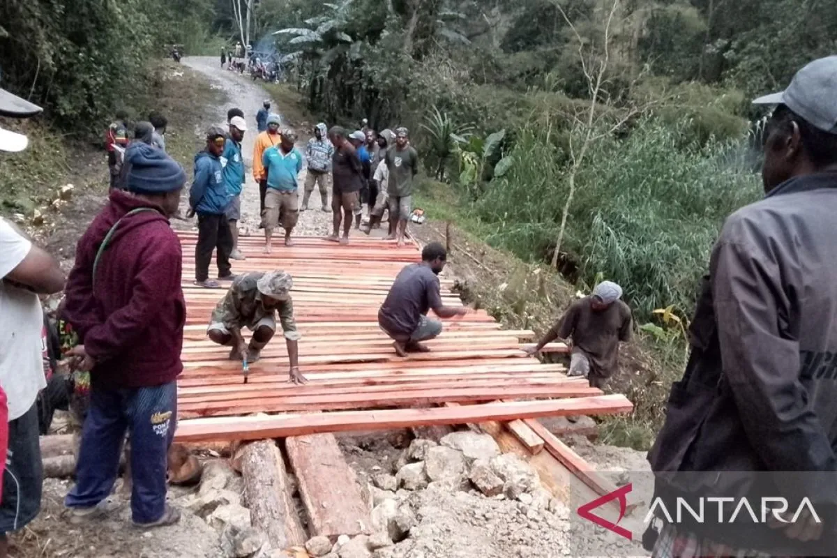 Wamena (ANTARA) - Pemerintah Kabupaten (Pemkab) Jayawijaya, Papua Pegunungan melalui Dinas Pekerjaan Umum dan Penataan Ruang (PUPR) setempat menyebut warga Distrik Wolo dan Bpiri swadaya memperbaiki jempatan putus yang disebabkan karena banjir.