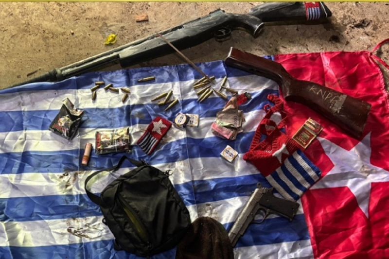 Setelah melakukan penyisiran kemudian ditemukan sebuah rumah yang di dalamnya ditemukan senpi dan amunisi beserta bendera Bintang Kejora serta berbagai perlengkapan anggota KKB.